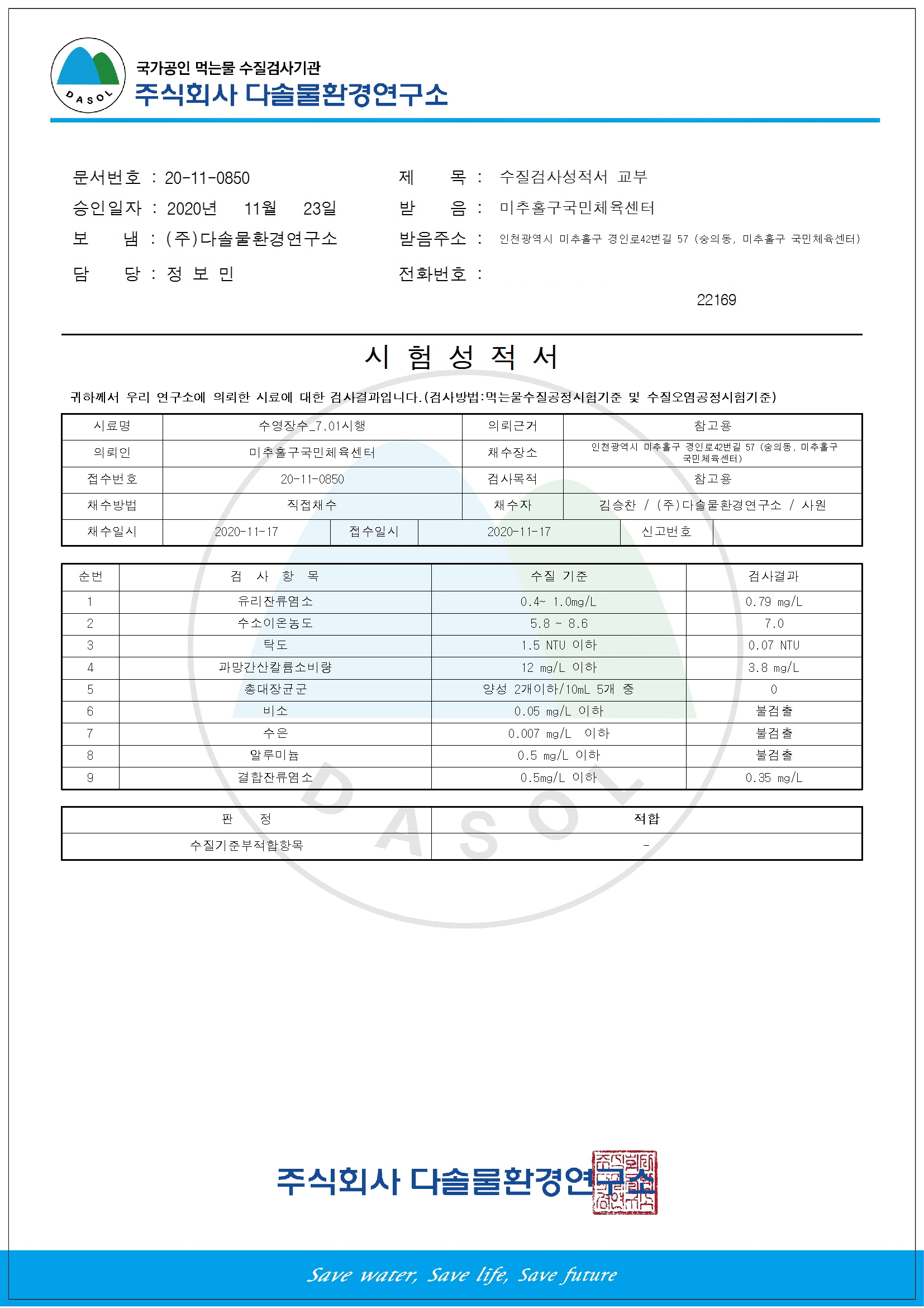 안녕하십니까. 미추홀구국민체육센터입니다. 고객 여러분의 안전하고 쾌적한 수영장 이용을 위해 수질 검사를 실시하였습니다. 수질 검사 결과를 붙임과 같이 안내해 드리오니 참고 바랍니다. ○ 검사일시: 2020. 11. 17.(화) ○ 특이사항: 없음 [붙임] 미추홀구국민체육센터 수영장 수질 검사 결과서 1부.