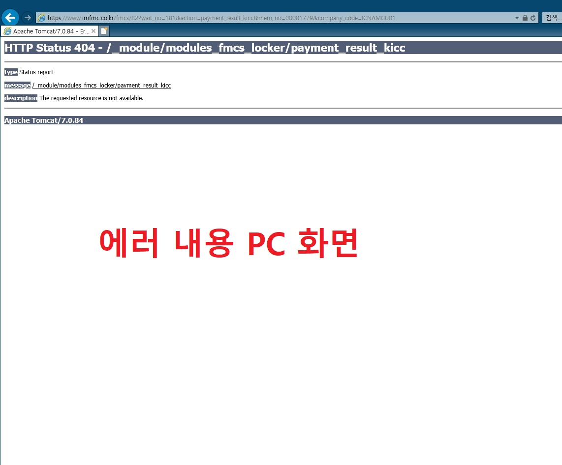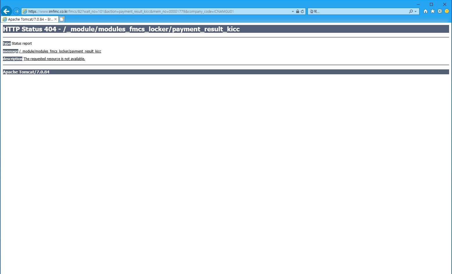 안녕하십니까? 개인 사물함 사용료을 인터넷에서 카드 결제하려는데 계속해서 에러 발생하네요? 마지막 정보확인 단계에서 아래와 같이 에러 발생으로 결제 완료가 안됨니다. 약관동의→카드선택/인증→정보확인→결제완료 # 아래 에러 발생 내용 HTTP Status 404 - /_module/modules_fmcs_locker/payment_result_kicc type Status report message /_module/modules_fmcs_locker/payment_result_kicc description The requested resource is not available. Apache Tomcat/7.0.84