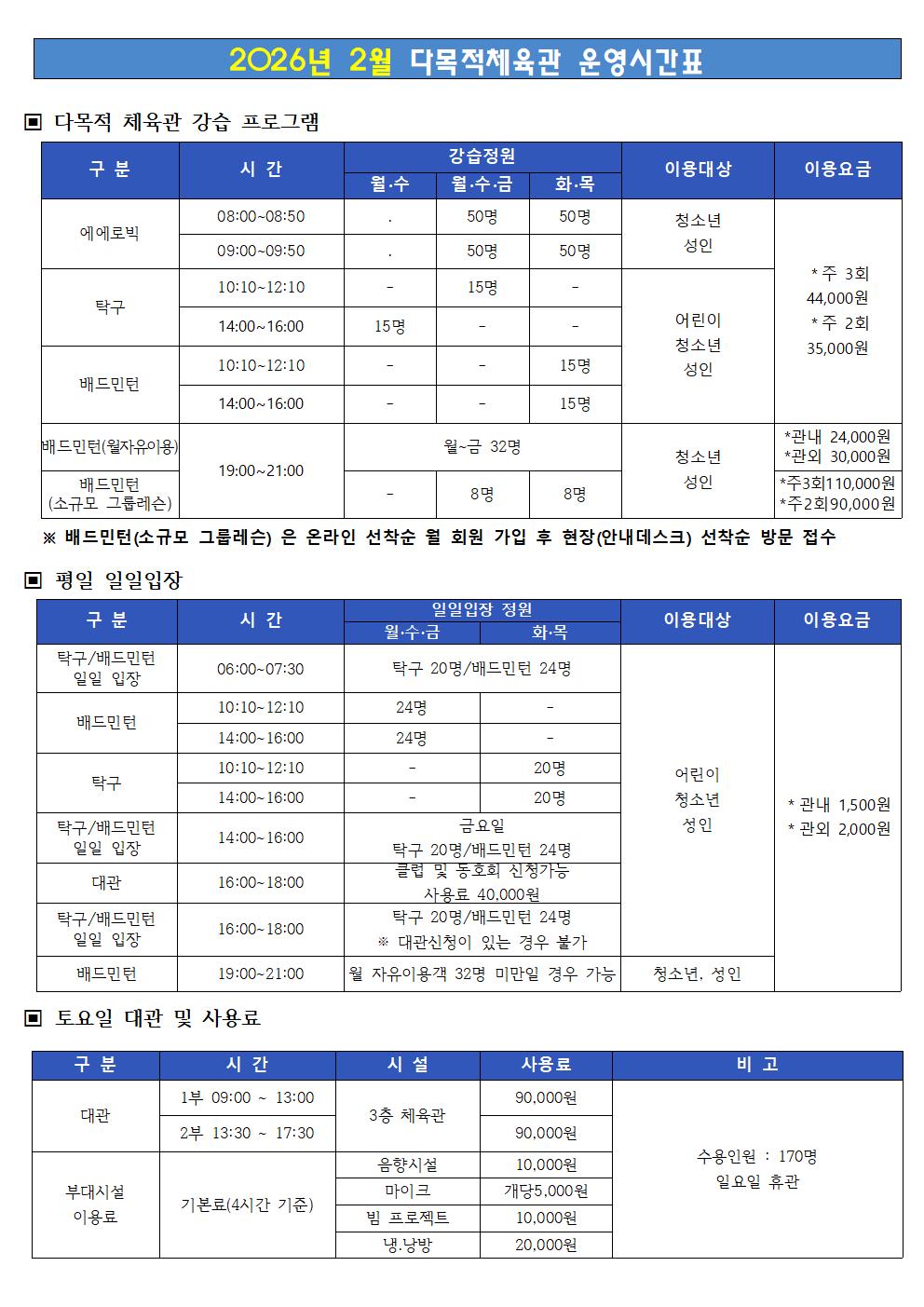 이번 결정은 단순히 저녁 탁구 이용자만의 문제가 아니라, 다목적체육관 전체 운영 방향과도 관련된 사안이라고 생각합니다. 실제로 2025년 12월과 2026년 2월의 운영시간표를 비교해 보면, 탁구와 배드민턴 모두 주간 수업 또한 상당 부분 축소된 것을 확인할 수 있습니다.