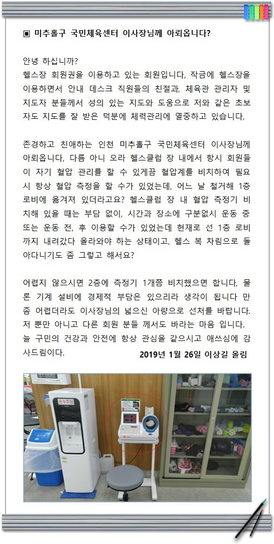 존경하고 친애하는 인천 미추홀구 국민체육센터 이사장님께 아뢰옵니다